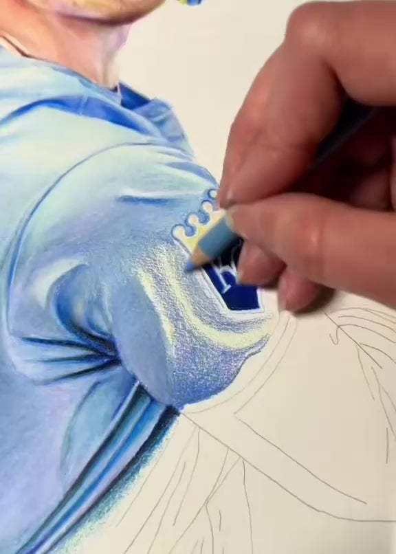 Capture the excitement of the game with this original 11x14, colored pencil drawing of the KC star, Bobby Witt Jr. This dynamic action shot portrays him mid-swing, showcasing both his power and precision at the plate. Professionally matted and framed, this drawing is ready to display and makes a striking centerpiece for any sports fan or collector.